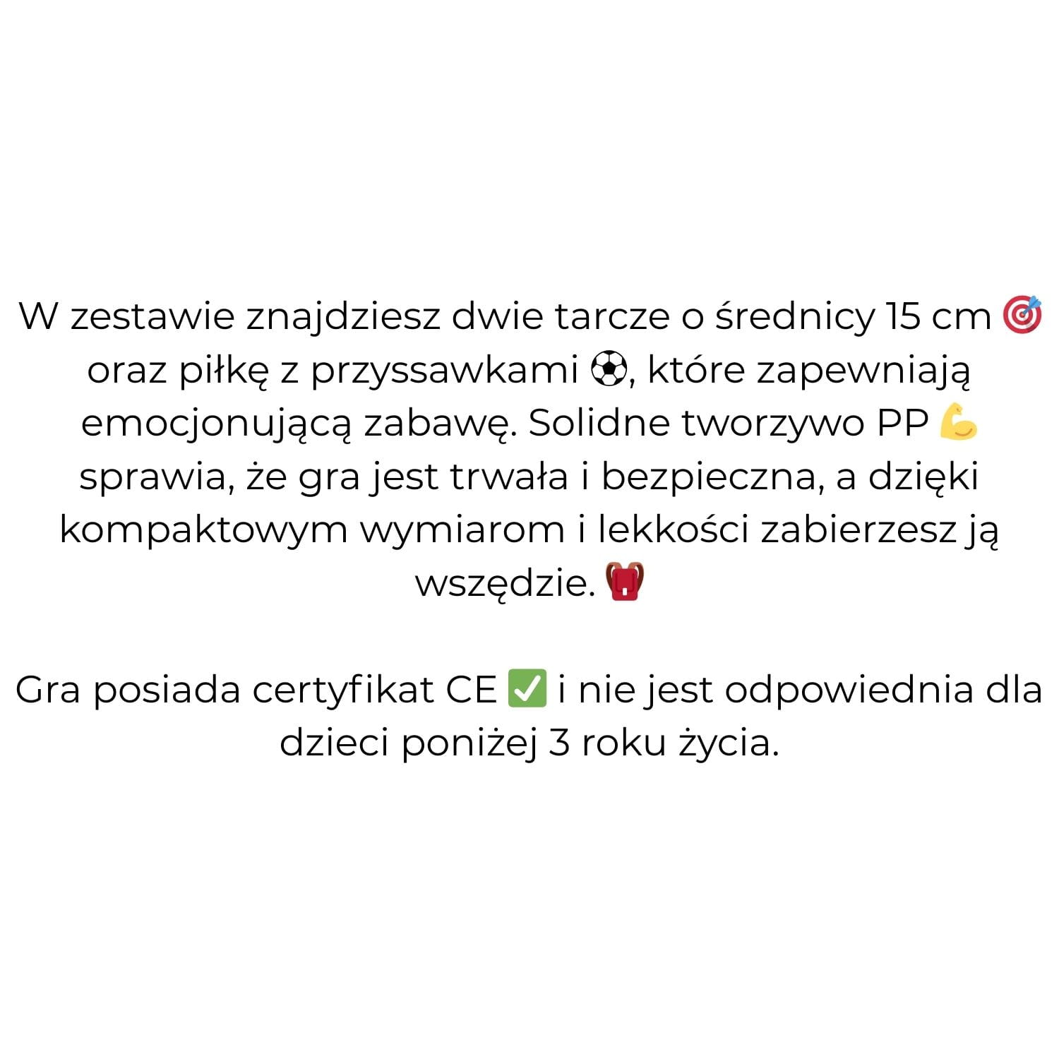 | Opis bezpieczeństwa: | Produkt przeznaczony do użytku rekreacyjnego na zewnątrz. Używać zgodnie z przeznaczeniem, z zachowaniem ostrożności, szczególnie w miejscach publicznych. Nie rzucać w kierunku ludzi lub zwierząt z bliskiej odległości. |